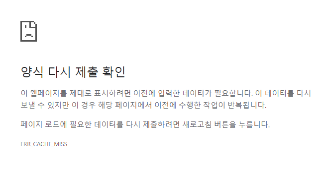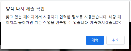 Chrome에서 POST 요청으로 페이지 이동후 뒤로 가기를 하면 아래와 같은 확인 페이지를 제공하도록 되어있습니다.