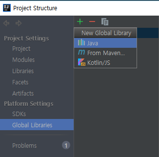 File - Project Structure창 Glbal Libraries에서 +버튼을 눌러 New Global Library에서 Java를 클릭합니다.