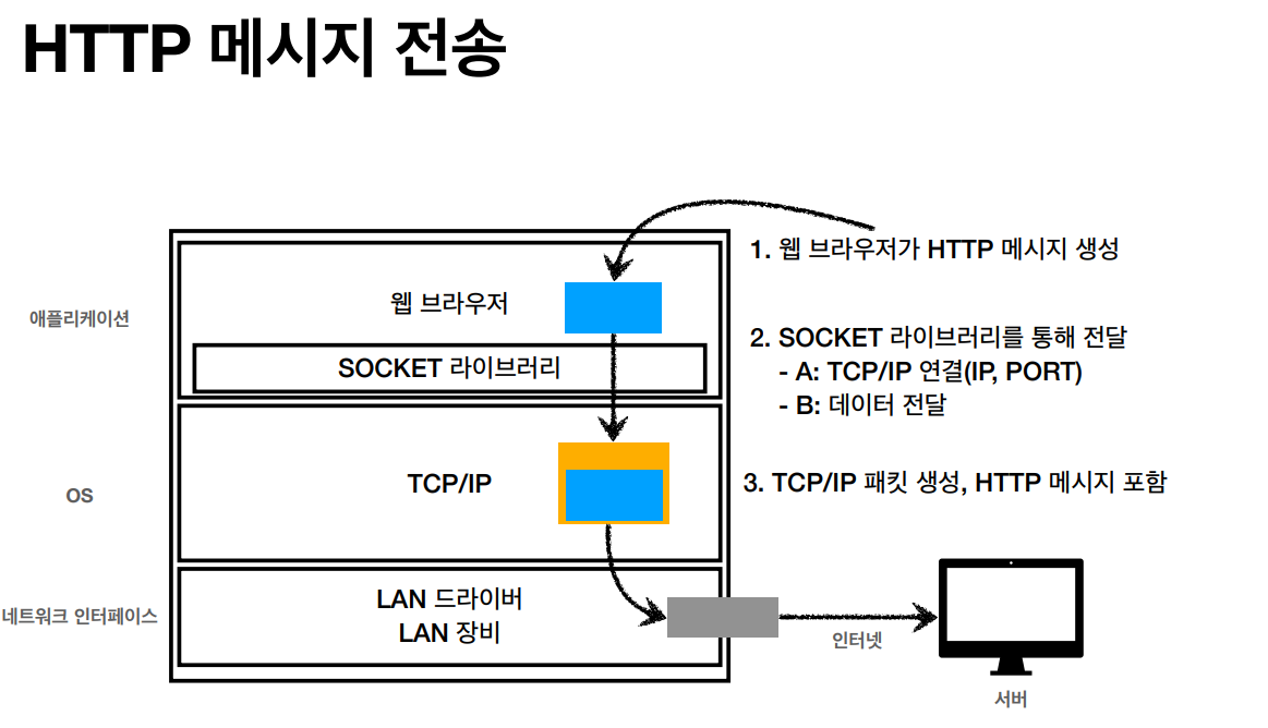 TCP/IP 패킷 안에 HTTP 메시지 포함 하여 LAN카드를 통해 인터넷으로 서버에 전송