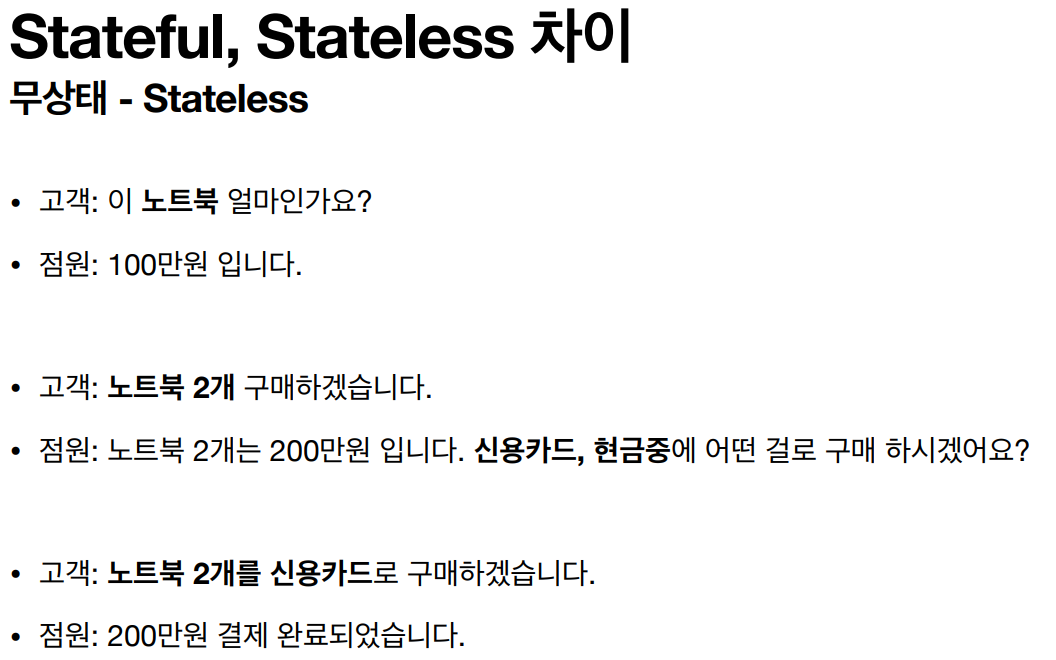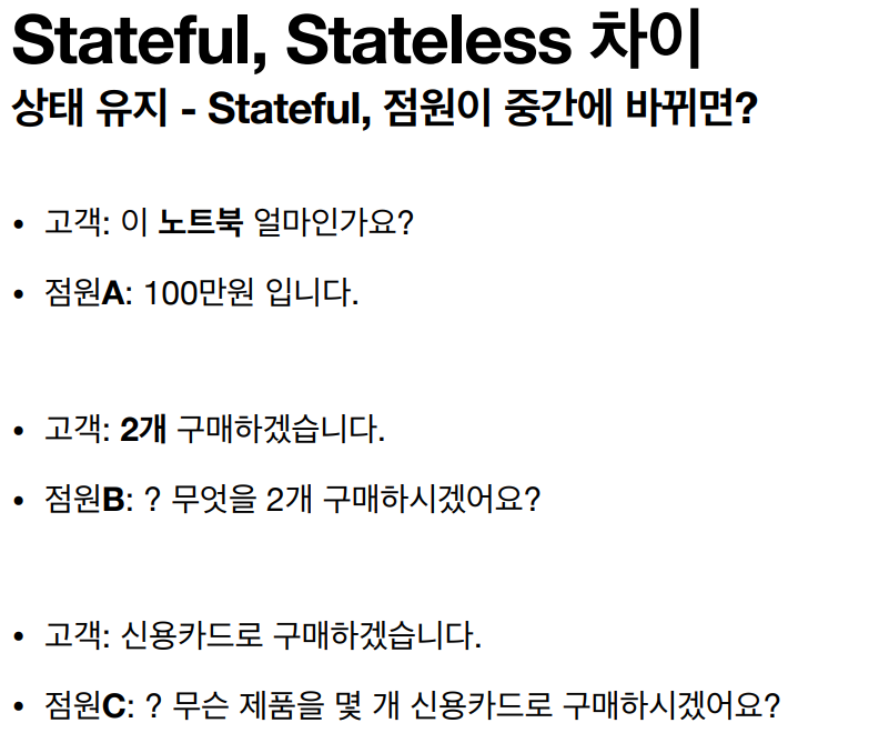 • 모든 것을 무상태로 설계 할 수 있는 경우도 있고 없는 경우도 있다.