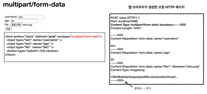 multipart/form-data 형식으로 전송을 하게 되면 자동으로 브라우저가 HTTP 메시지를 생성해준다.
