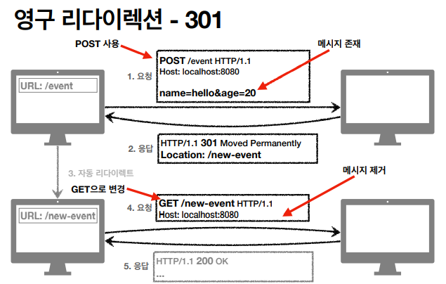 - 리다이렉트시 요청 메서드가 GET으로 변경