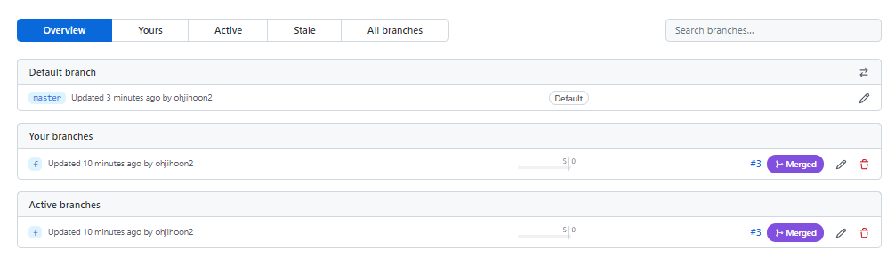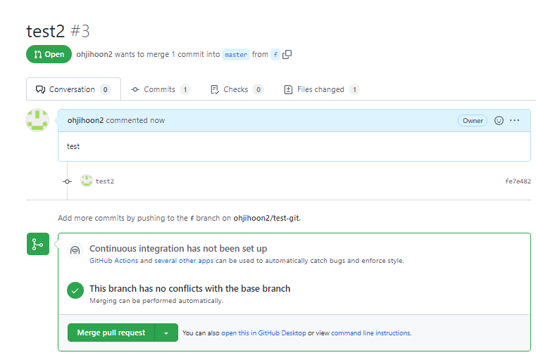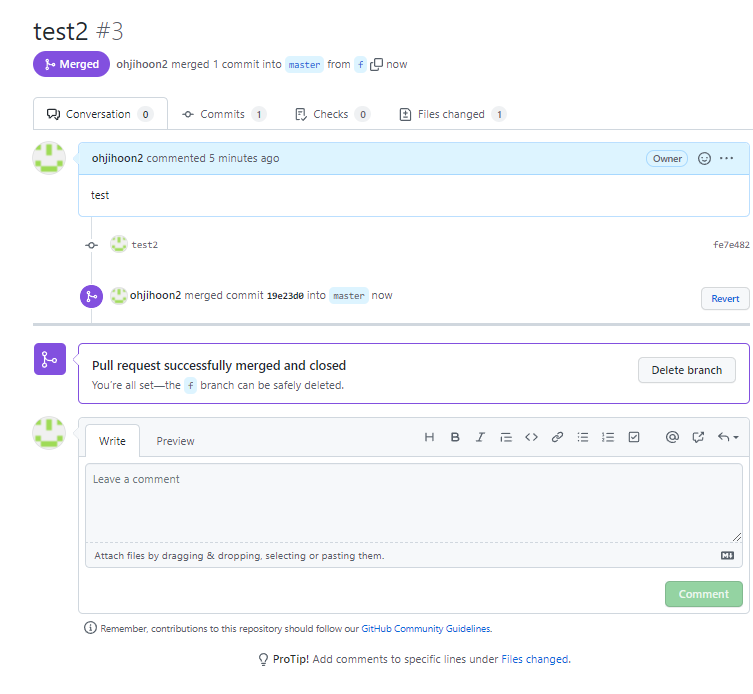 7. 브랜치가 병합된 상태라면 'merged'라고 표시 되어 있음