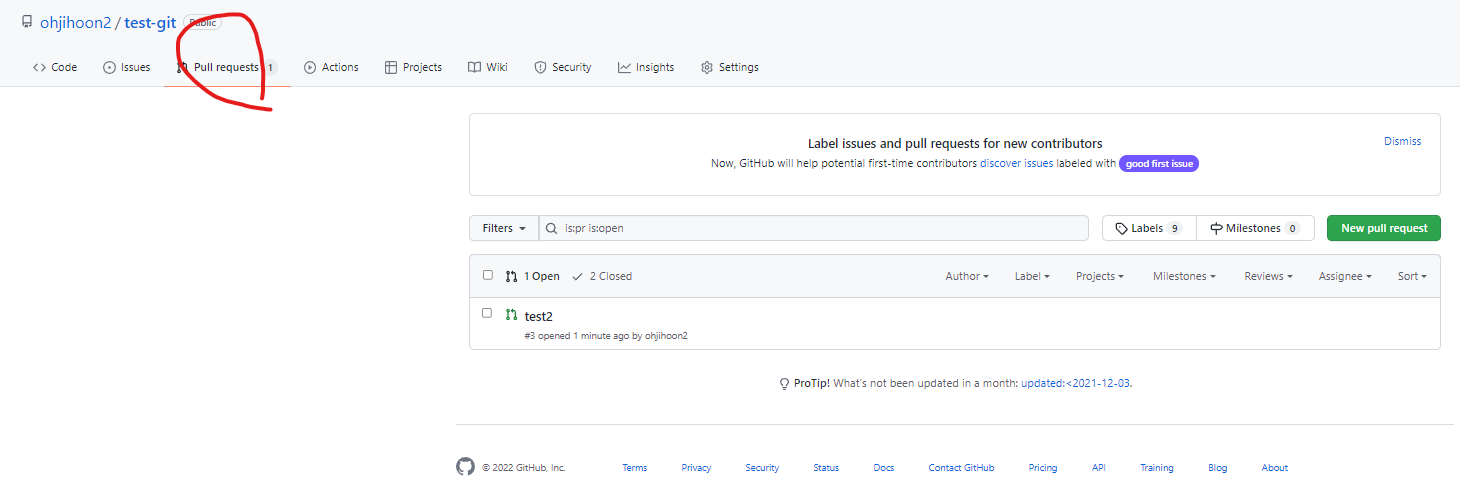 저장소 목록의 pull request를 누르면 등록된 pull request 목록이 나타남.