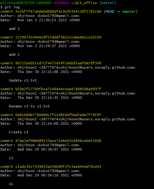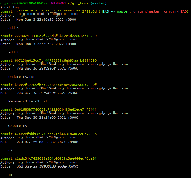 최종 커밋인 add 3 앞에 (HEAD -> master, origin/master, origin/HEAD) 표시 되어 있음