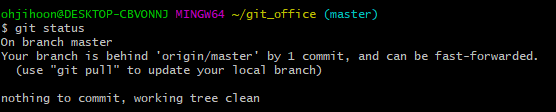 현재 branch가 origin/master에 비해 1개의 커밋이 뒤처져 있다고 나옴