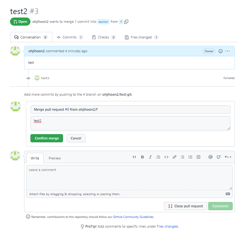 4. pull request message를 살펴본 다음 내요에 문제가 없으면 [Merge pull request] 를 눌러 병합함