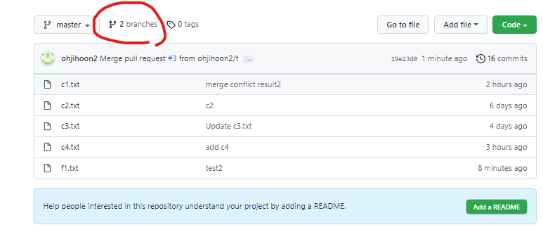 브랜치 상태를 알고 싶다면 파일 목록 위에 있는 '2 branches' 클릭
