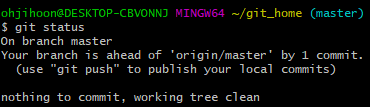 현재 master 브랜치가 origin에 있는 원격 master 브랜치보다 버전이 하나 앞서 있는것을 알 수 있음