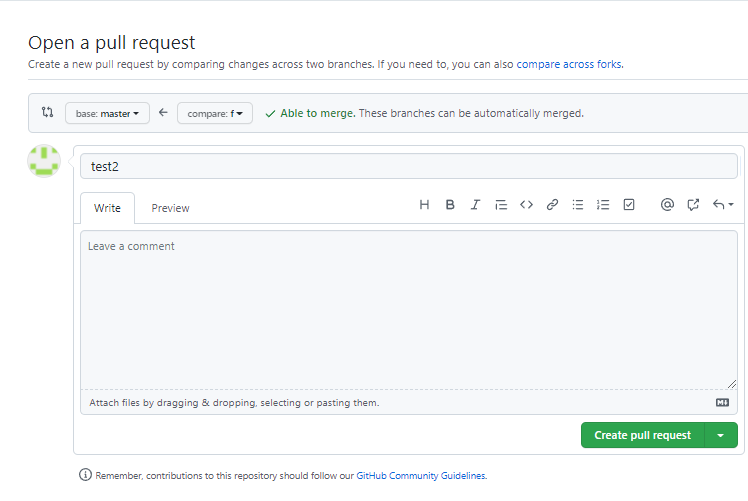 2. pull request message 작성 한 후 create pull request 누르면 협업중인 저장소에 pull request 가 전송 됨